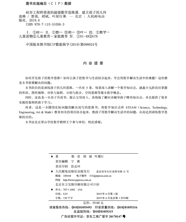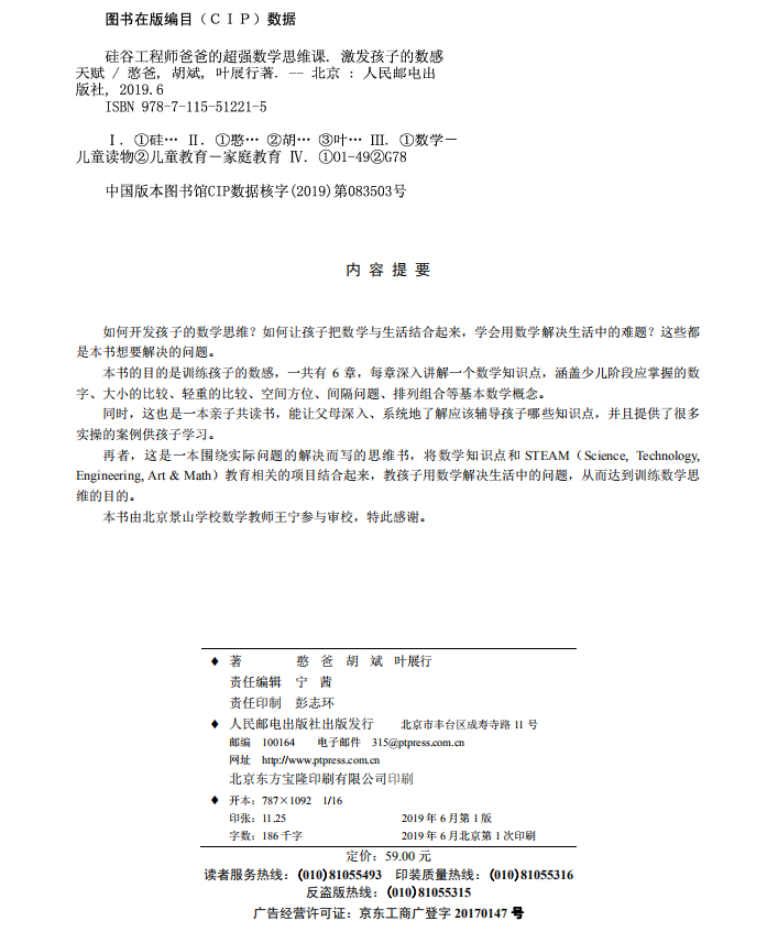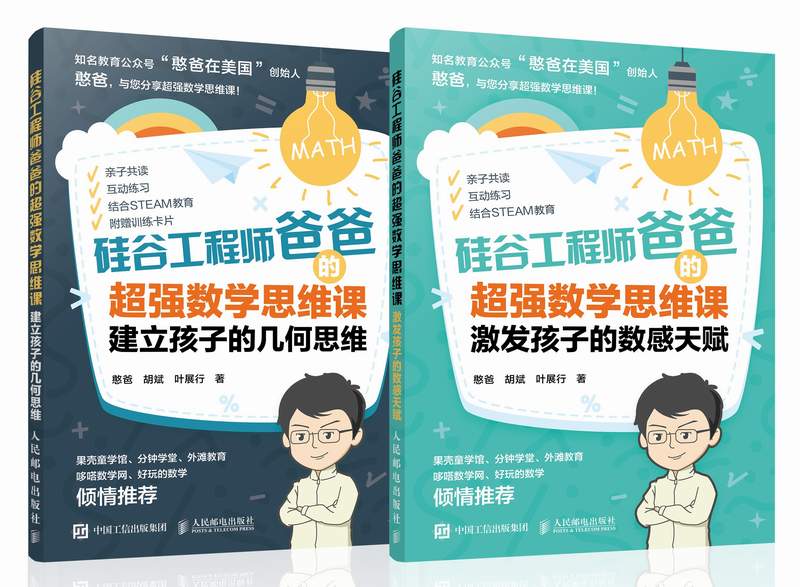 憨爸:名校碩士畢業(yè)、微信公眾號“憨爸在美國”創(chuàng)始人、硅谷著名IT公司技術(shù)經(jīng)理。著有暢銷書《硅谷工程師爸爸的超強思維訓練課》和《硅谷工程師爸爸的超強思維導圖課》,參與翻譯及審校《DK編程玩起來》《DK圖解數(shù)學》《DK燒腦思維訓練手冊》《DK幼兒創(chuàng)意思維訓練》《寶寶的編程》《我的數(shù)學之路:美國經(jīng)典數(shù)學思維啟蒙全書》等幾十本童書。