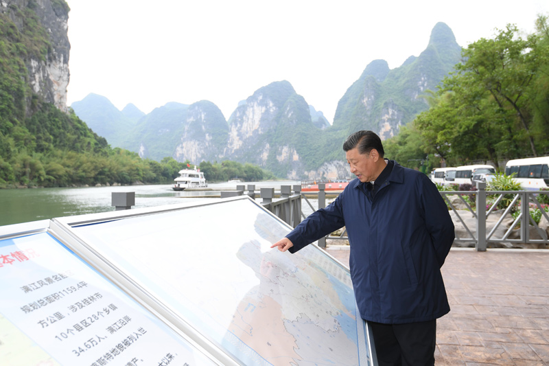 4月25日至27日,中共中央總書記、國家主席、中央軍委主席習近平在廣西考察。這是25日下午,習近平在桂林市陽朔縣漓江楊堤碼頭,了解漓江流域綜合治理、生態保護等情況。新華社記者 申宏 攝