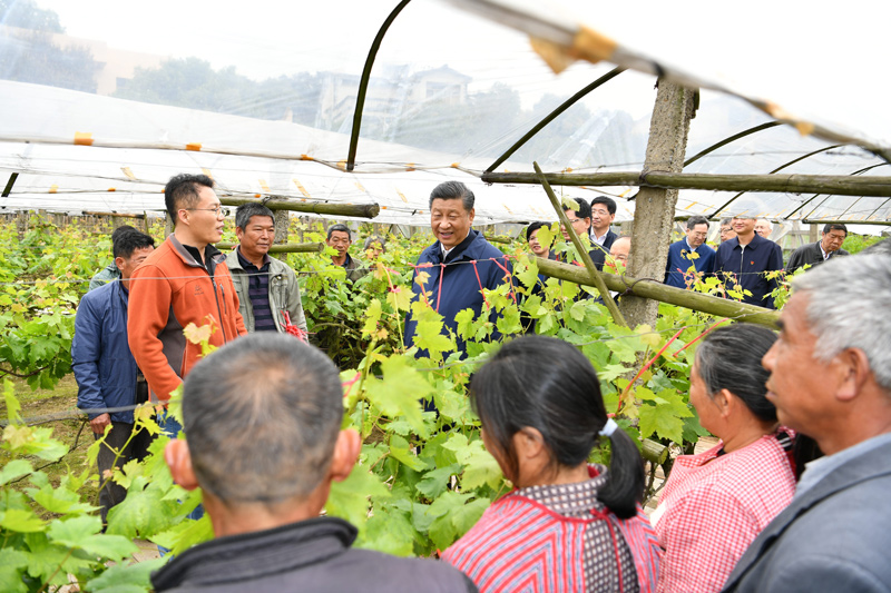 隨后,習近平來到才灣鎮毛竹山村。該村近年來積極發展葡萄種植業,有力促進了農民增收。習近平走進葡萄種植園,察看葡萄長勢。農技人員正在指導村民為葡萄綁蔓、定梢,看到總書記來了,鄉親們紛紛圍攏過來。習近平詳細詢問葡萄產量、品質、銷路、價格等情況。他強調,全面推進鄉村振興,要立足特色資源,堅持科技興農,因地制宜發展鄉村旅游、休閑農業等新產業新業態,貫通產加銷,融合農文旅,推動鄉村產業發展壯大,讓農民更多分享產業增值收益。