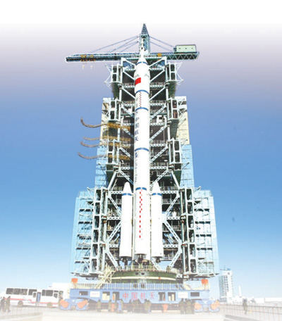 2002年12月,神舟四號船箭塔組合體轉運到發射塔架上。紅 柳攝(人民視覺)